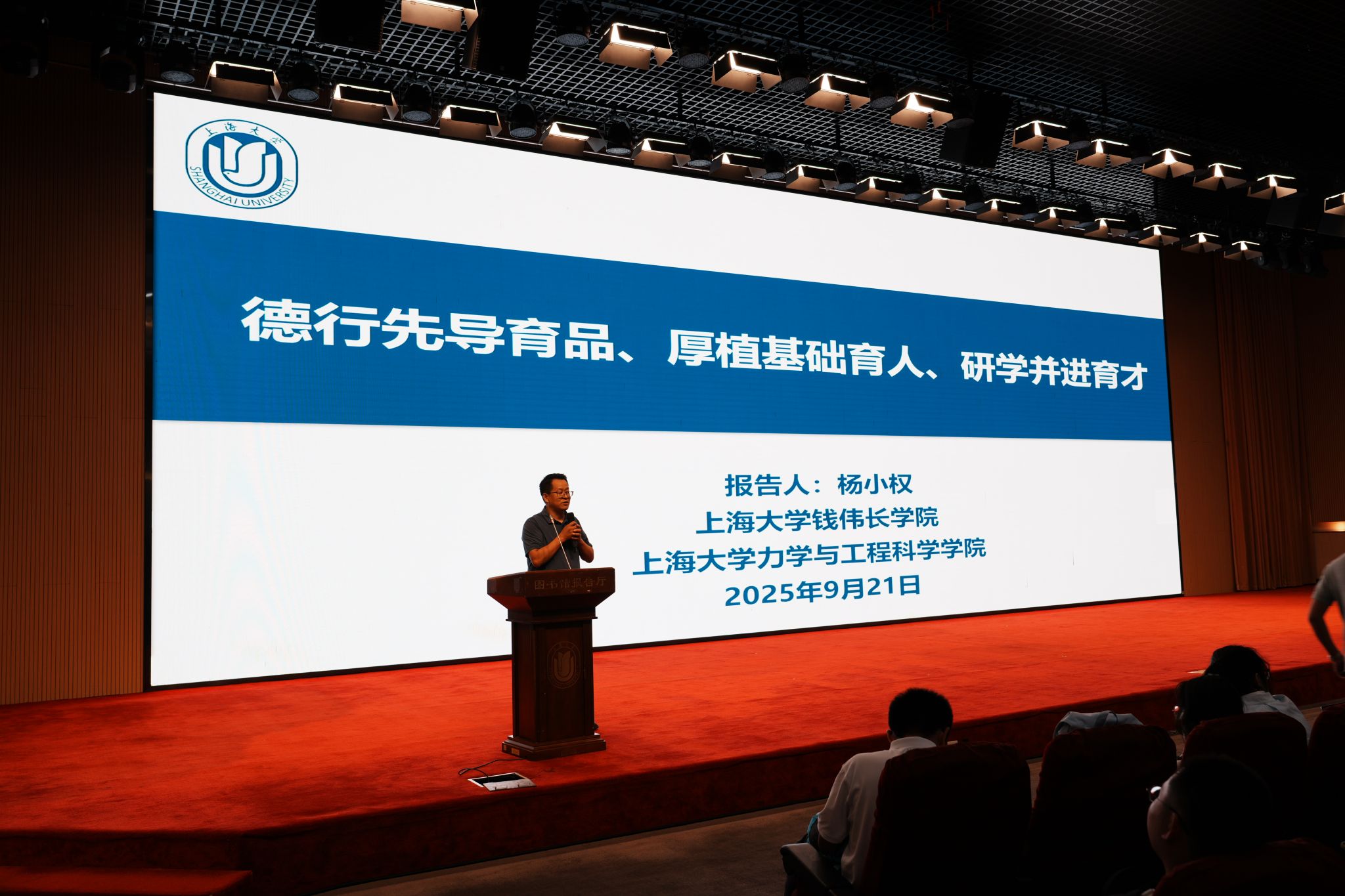 2025年9月21日晚18:30,钱伟长学院2025-2026学年秋季学期首日教育暨2025级新生开学典礼在宝山校区图书馆报告厅举行。钱伟长学院全程导师代表、力学与工程科学学院力学系系主任杨小权,钱伟长学院党委副书记、副院长沈青松,各年级辅导员以及学生出席了本次活动。活动由沈青松老师主持。