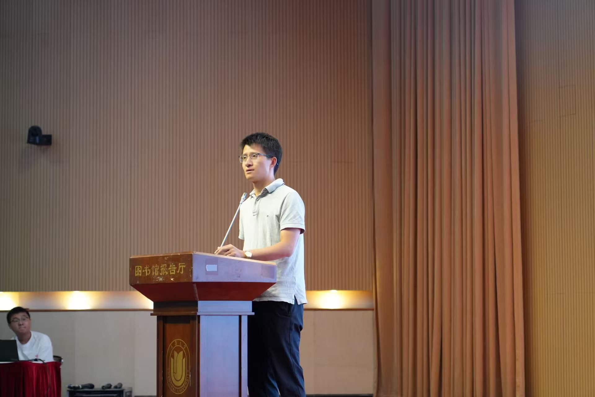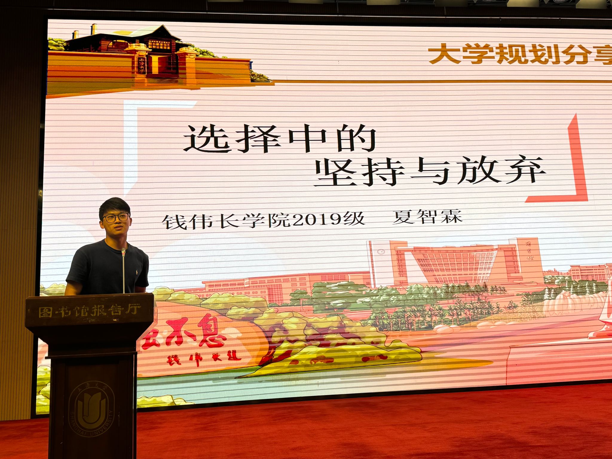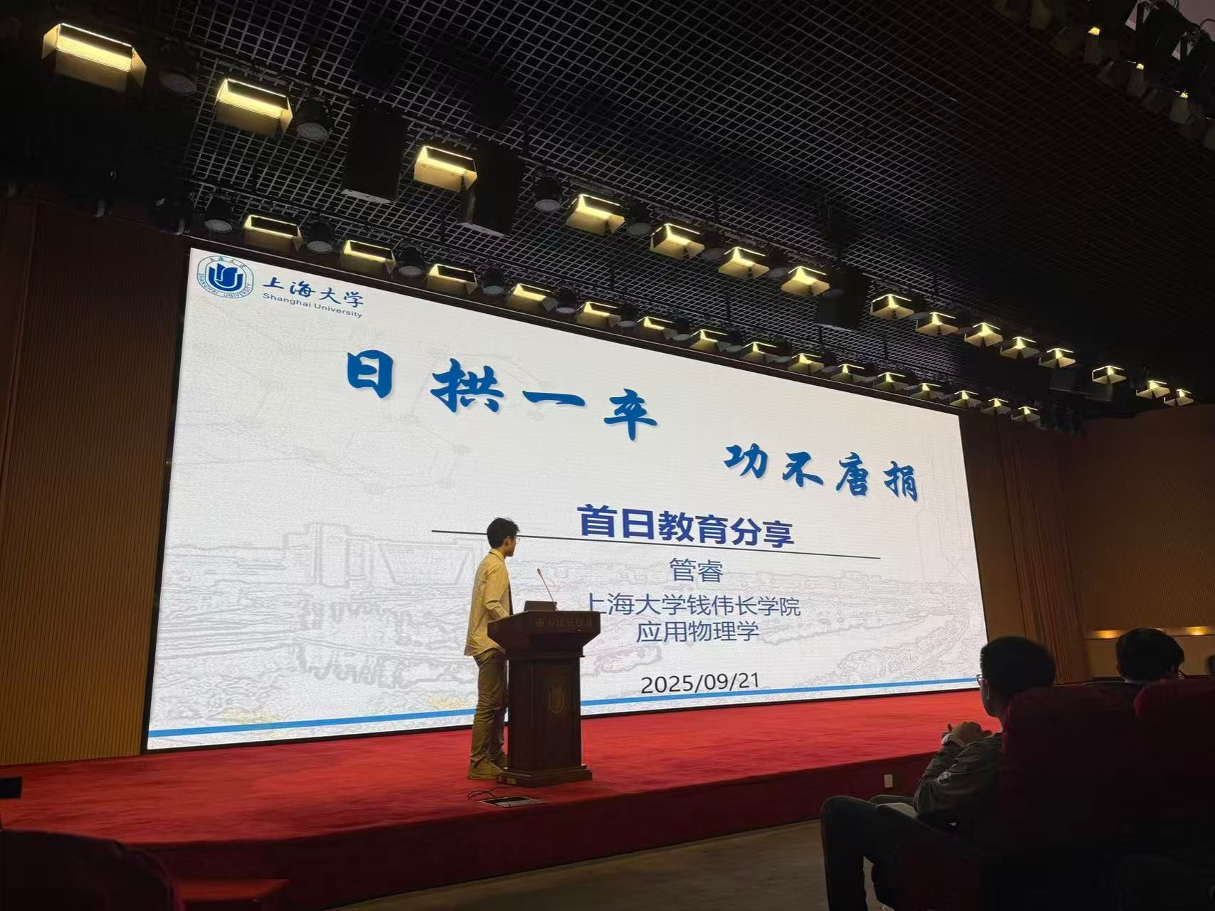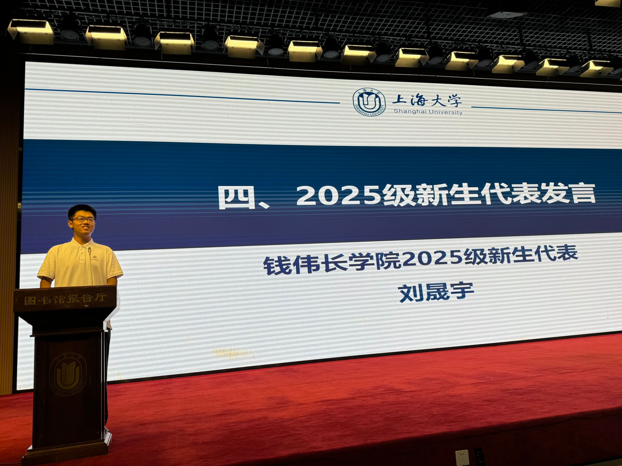 接下来,刘晟宇同学作为钱伟长学院2025级新生代表上台发言。他从自己为何选择上海大学说起,娓娓道来他眼中的上大,当他说起选择钱伟长学院的原因时,他明确表示,我们国家的长足发展,需要一大批理科基础扎实并能够将数理基础运用于国家的科技创新的人才作为坚实的后盾。最后,他表达自己立志要深耕于生物医学领域,希望能在钱伟长学院的平台上,苦练过硬学术本领,未来在生物科技领域有所成绩。