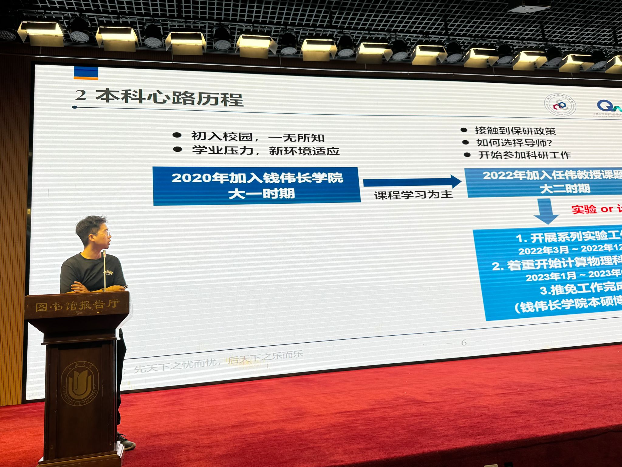 之后,四位钱伟长学院优秀院友、学生代表针对本科不同阶段的学习经验做了交流分享。2023届院友、上海交通大学直博生夏智霖以“选择中的坚持与放弃”为主题,从课程、专业、导师、未来去向等多个维度,剖析大学各阶段面临的关键节点。夏智霖鼓励同学们要勇于试错、理性抉择,不做抱怨者,而做改变者,以主动姿态把握属于自己的大学四年。2024届院友、上海大学直博生羊英涛结合自己本科阶段在各平台的科研学习和对外交流经历给同学们做了细致分享,他希望同学们多关注学院官网,主动争取各种国内外交流机会,不断开阔视野、提升团队协作与综合能力。2022级材料设计科学与工程专业本科生李蝉羽从学业成绩、科研经历和实践经历三个方面分享了她的大学生活。她指出,低年级同学若想做好科研,就必须胆大、主动,主动寻找科研机会,与学业导师紧密联系,积极参与学术会议等,逐步积累科研经验。同时,李蝉羽建议大家不要只关注成绩,也应“闻窗外事”,促进自身全面发展。2022级应用物理学专业本科生管睿基于自身本科前三年的科研与论文写作、发表经历,围绕“明确目标、学会学习”、“积极了解、积极社交”、“学科竞赛、科研探索”三个要点分享经验,鼓励同学们“从容思考、从速实行”,勇敢尝试、创造可能。