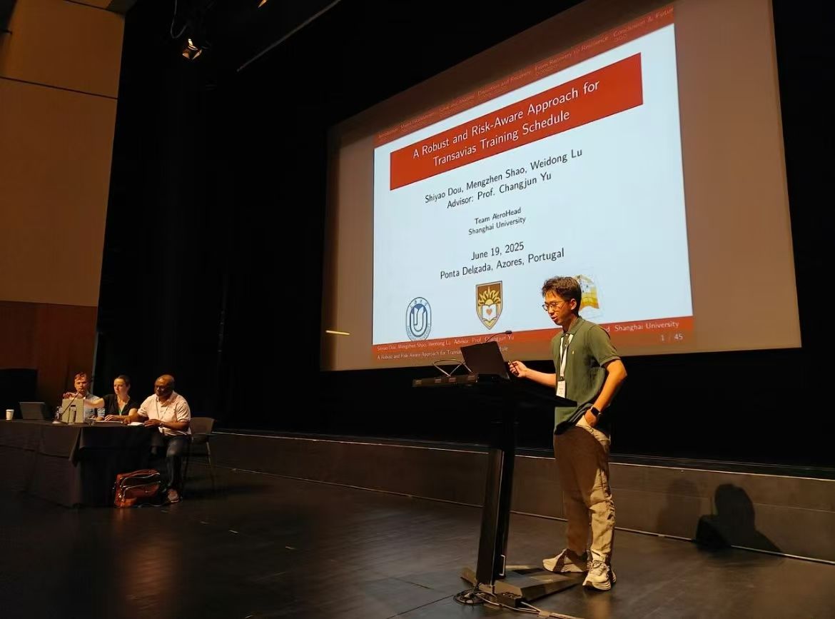 决赛在葡萄牙亚速尔群岛(Azores Islands)举行。在 MOPTA 2025 国际优化建模大会上,窦诗耀作为团队队长,与来自达特茅斯学院、佐治亚理工学院等高校的入围团队共同进行了英文汇报展示。本届比赛共有来自六个国家的19支队伍参赛,最终共有三支团队受邀进入大会现场决赛。上海大学团队凭借扎实的建模思路与系统的优化设计,获得了学术界与业界专家的积极反馈。