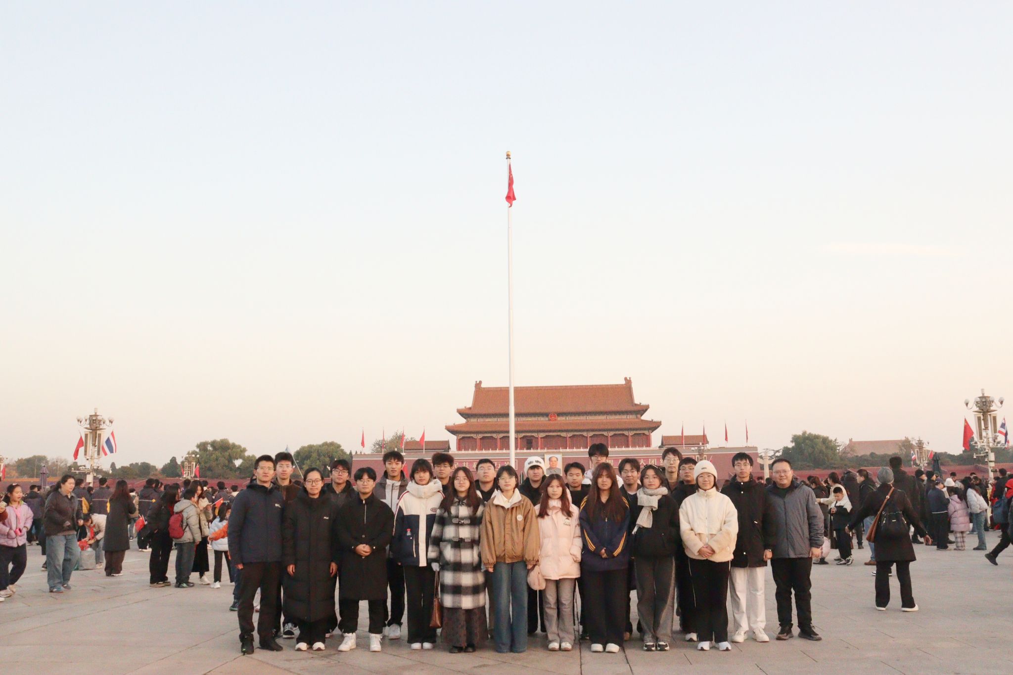 11月15日凌晨,寒意浸染晨光,学子们怀着无比崇敬的心情奔赴天安门广场,静候升旗仪式的庄严时刻。当东方泛起鱼肚白,国旗护卫队迈着铿锵整齐的步伐踏破晨曦,挺拔的身姿、坚定的眼神尽显大国仪仗的威严。伴随着雄壮激昂的《义勇军进行曲》,五星红旗冉冉升起、迎风飘扬,现场师生肃立致敬,目光紧紧追随着鲜红的旗帜,内心涌动着对祖国母亲的无限热爱与自豪。学生骨干罗守昊深有感触:“北京是一座有着厚重历史气息的城市。人们常说去北京天安门看升旗是一份独属于国人的浪漫,而当我凌晨四点钟天还没亮时看着人们排着长长的队伍准备进入天安门广场,我才对这句话有了更深刻的实感。站在天安门广场,刺骨的寒风扑在脸上,但当我们看着朝阳爬上国家博物馆,看着护旗手们踏着整齐的步伐走来,听着国歌音乐的响起以及充斥在耳边的男女老少的声音,不由感生出一份自豪,排队的劳累也一扫而空。”这一刻,青春感悟与爱国情怀交织共鸣,让学子们深刻体会到“国家”二字的千钧重量,更坚定了“强国有我”的决心。
