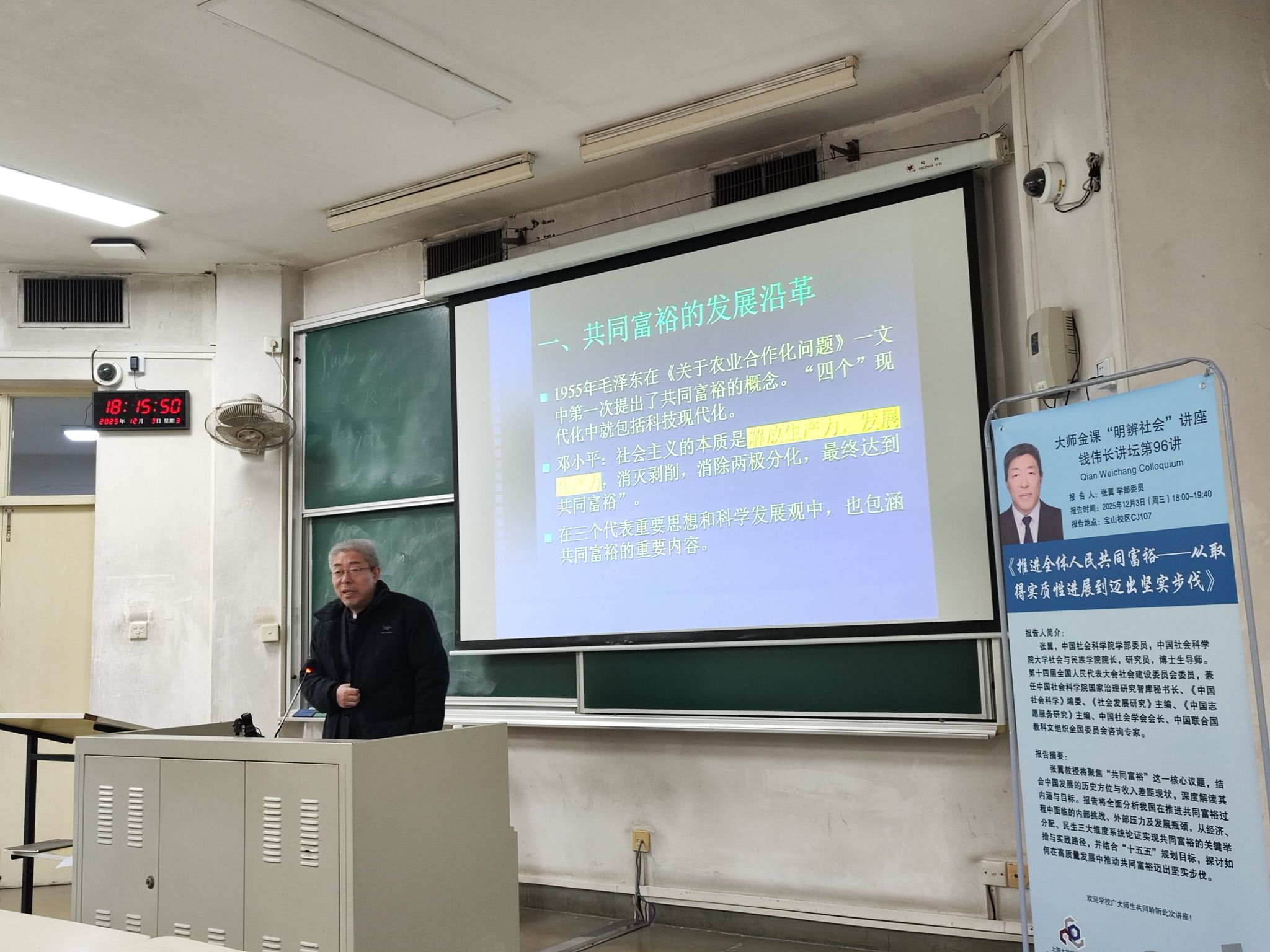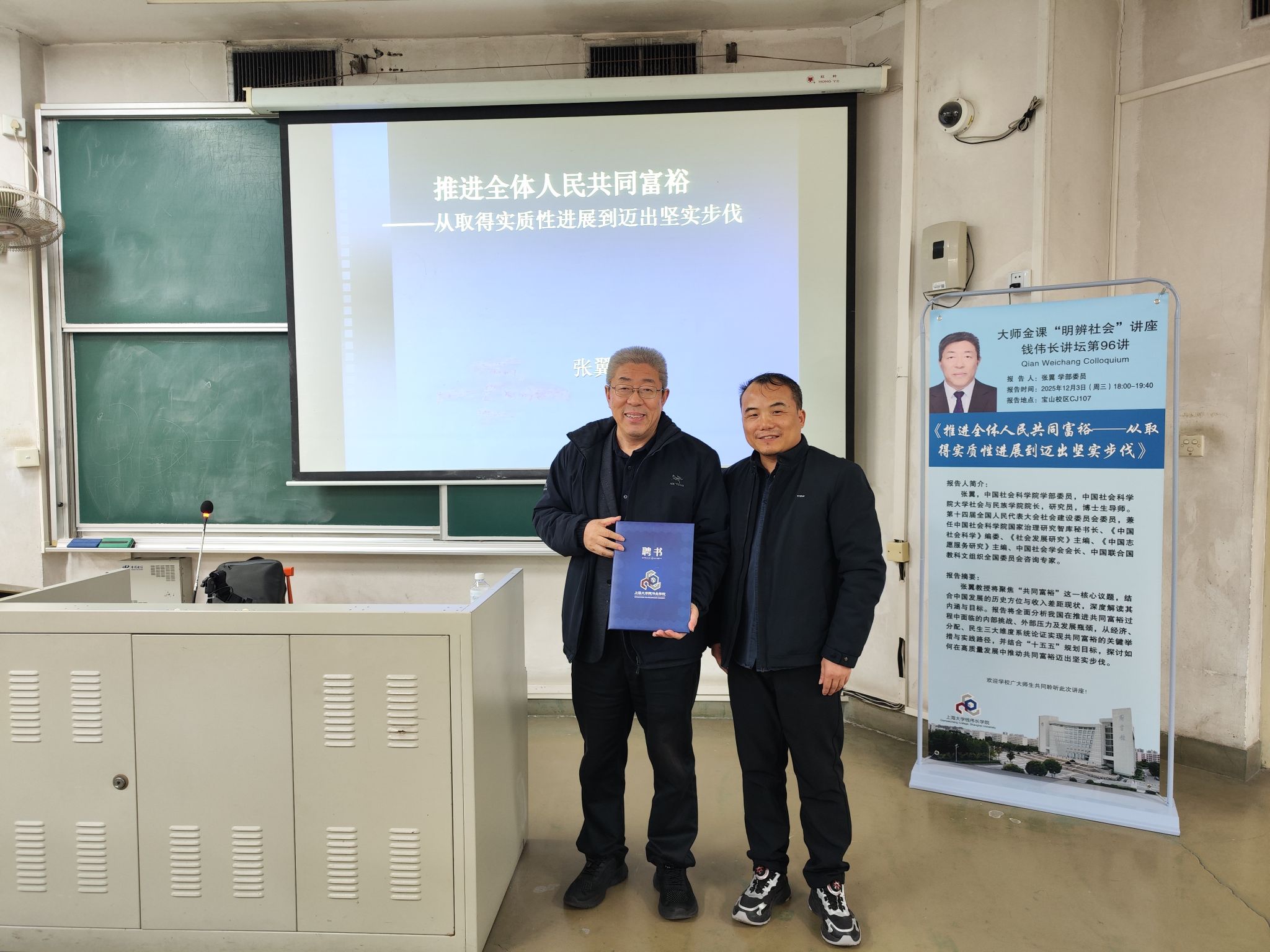 12月3日,钱伟长讲坛第96讲暨“大师金课”《明辨社会》系列课程讲座在上海大学宝山校区举行。本次讲座以“推进全体人民共同富裕——从取得实质性进展到迈出坚实步伐”为主题,邀请中国社会科学院学部委员、中国社会学会会长张翼研究员担任主讲。社会学院党委书记杨锃、钱伟长学院副院长许新建、文科处副处长金桥及钱伟长学院、社会学院的师生代表参加了活动。讲座开始前,许新建副院长代表钱伟长学院向张翼研究员颁发了《明辨社会》课程授课教师聘书。