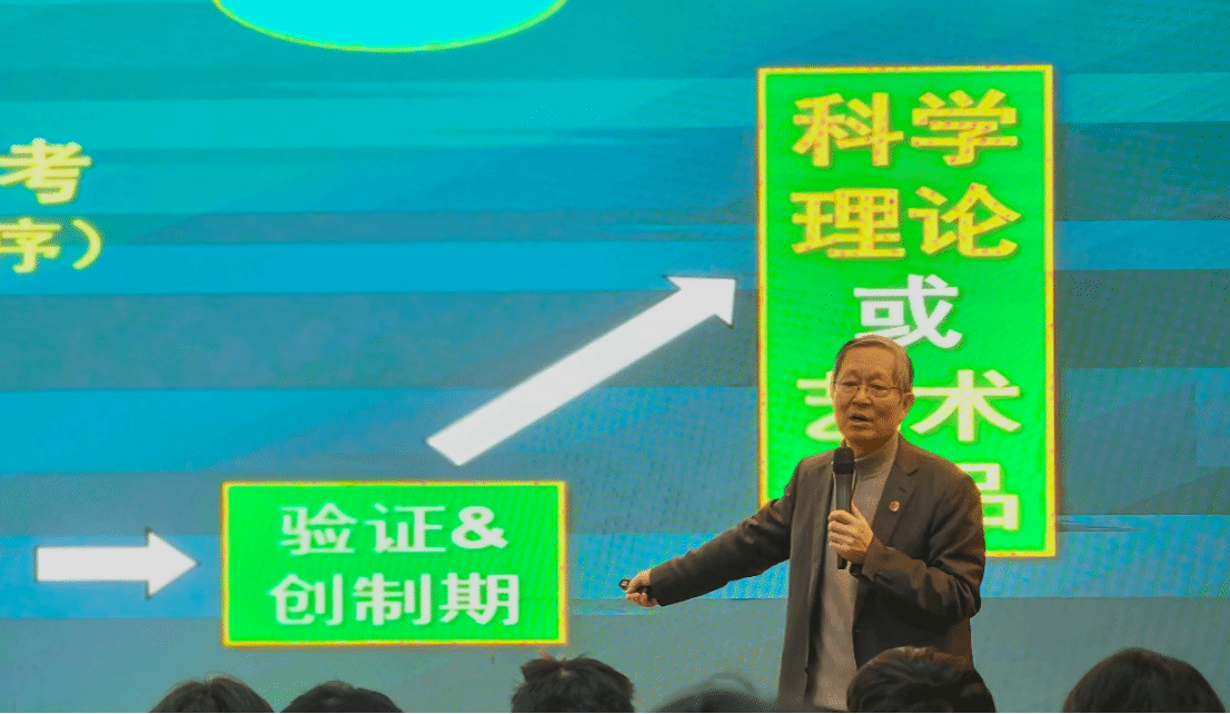 在“创新”部分,卢教授对比了科学思维(理性、逻辑、具象)与艺术思维(感性、非逻辑、抽象)的差异。他强调,创造性过程的顿悟期恰恰需要艺术思维的激发,并以阿基米德浴盆顿悟、凯库勒梦到苯环结构为例,说明灵感的价值。“右脑是被我们忽视的宝藏,听音乐、绘画、冥想都可以开发右脑,让理性与感性协调发展,这才是创新思维的源泉。”